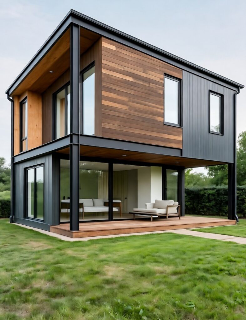 Una casa steel frame de dos pisos es una estructura moderna construida con un marco de acero ligero, combinando metales y madera para un diseño resistente y sostenible. Su fachada vidriada con ventanales grandes ofrece iluminación natural y un estilo contemporáneo en ambos niveles. Las ventajas incluyen mayor resistencia a desastres naturales, rapidez en la construcción y eficiencia energética. Una casa de dos pisos maximiza el espacio vertical, ideal para familias grandes, y añade valor estético y funcional. Comprarla es conveniente por su durabilidad, personalización y potencial de revalorización a largo plazo.